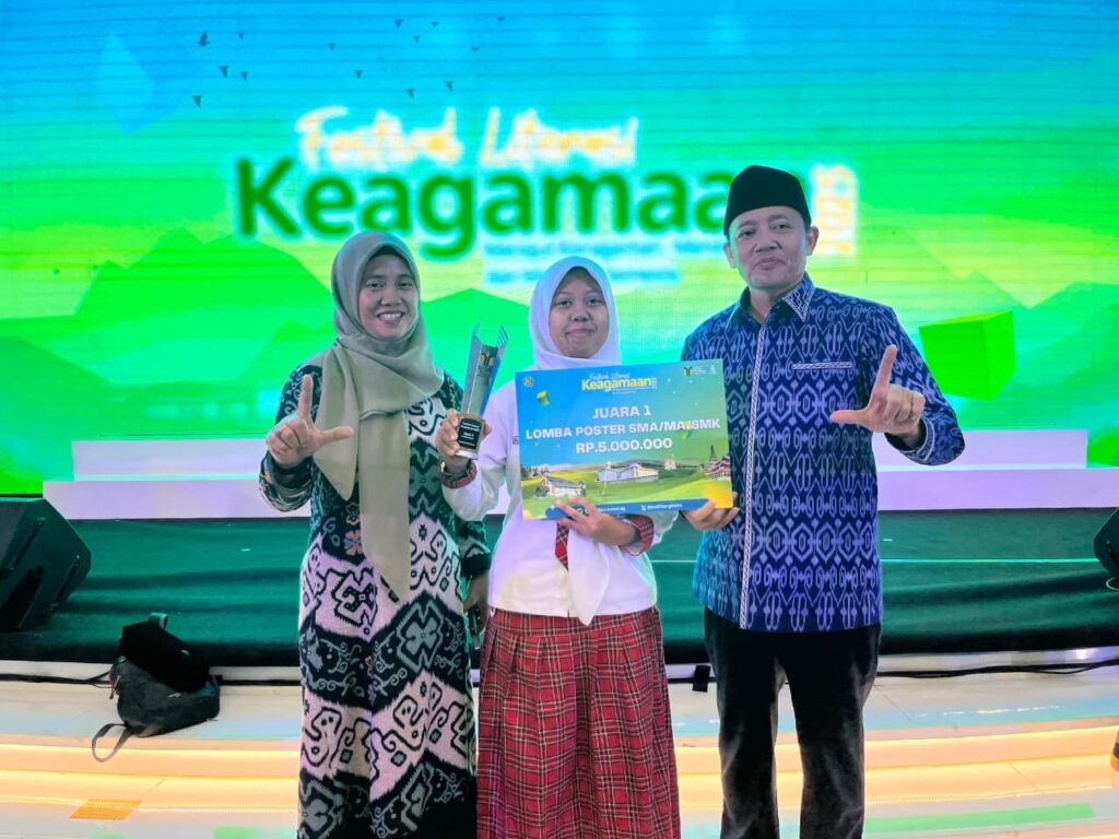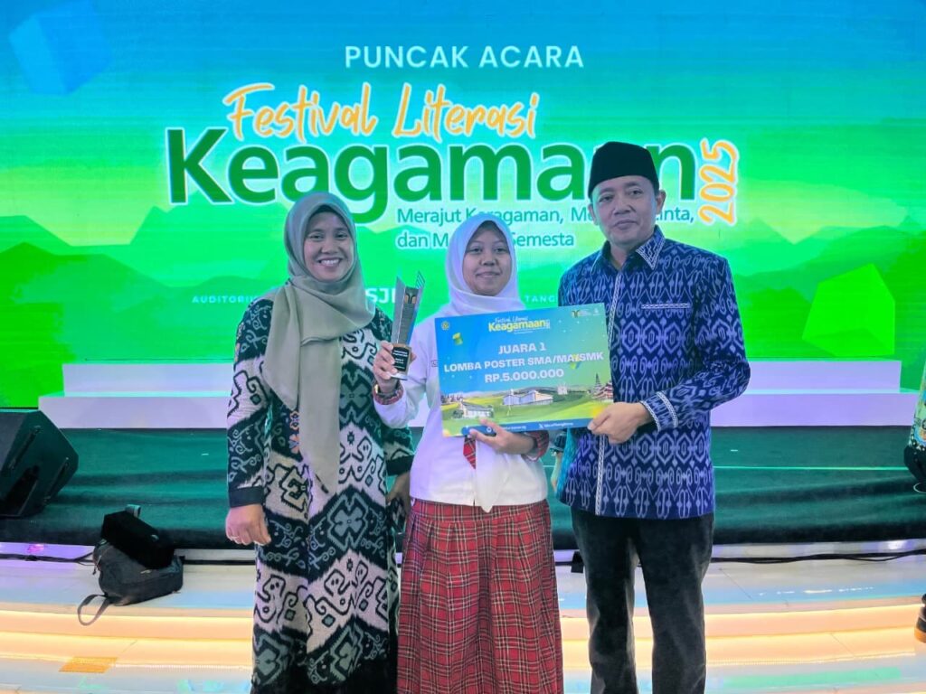 KOTA BATU, SMAN 2 BATU– Alviena Citranti Anindya Putri, siswa kelas X-6 SMAN 2 Batu yang berhasil meraih juara 1 nasional Lomba Poster Moderasi di ajang Festival Literasi Keagamaan yang diselenggarakan Kementerian Agama RI menerima piala dan hadiah uang pembinaan dari panitia, Kamis (20/11/25) di Auditorium HM Rasjidi Kementerian Agama Jl. MH Thamrin No 6, Kebon Sirih, Menteng, Kota Jakarta Pusat. Hadiah diserahkan langsung oleh Dr. H. M. Sidik Sisdiyanto, M.Pd., Kepala Pusat Penilaian Buku Agama, Lektur, Keagamaan Kemenag RI.