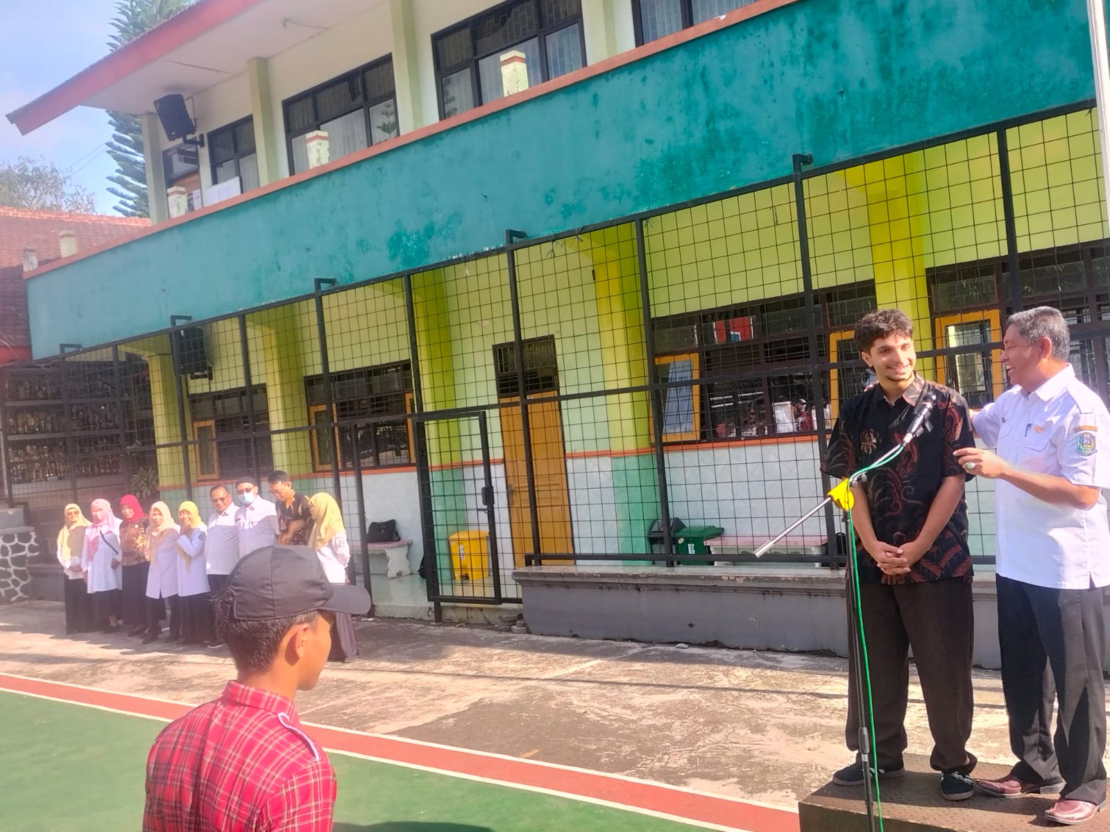 KOTA BATU- Beradcan Orak, siswa asal Turkey mengikuti Program American Field Service (AFS) tri semester di SMA Negeri 2 Batu. Selama sekitar 50 hari di SMA Negeri 2 Batu, Beradcan Orak akan belajar tentang kebudayaan Indonesia. Kedatangan siswa asal Turkey ini disambut hangat ratusan siswa dan guru dalam sebuah apel yang dilaksanakan di lapangan basket sekolah setempat, Rabu (5/11/25) pagi.