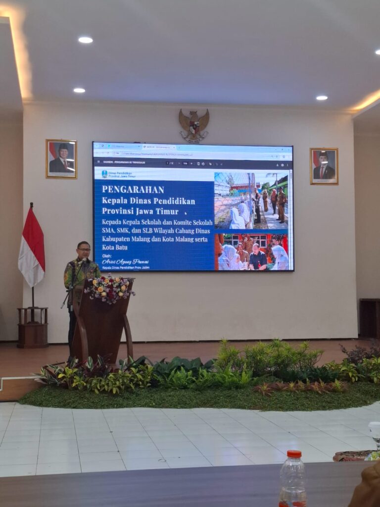 Kadis Pendidikan Provinsi Jatim, Aries Agung Paewai saat memberikan pengarahan kepada para kepala SMA/SMK/SLB Negeri se-Malang Raya.