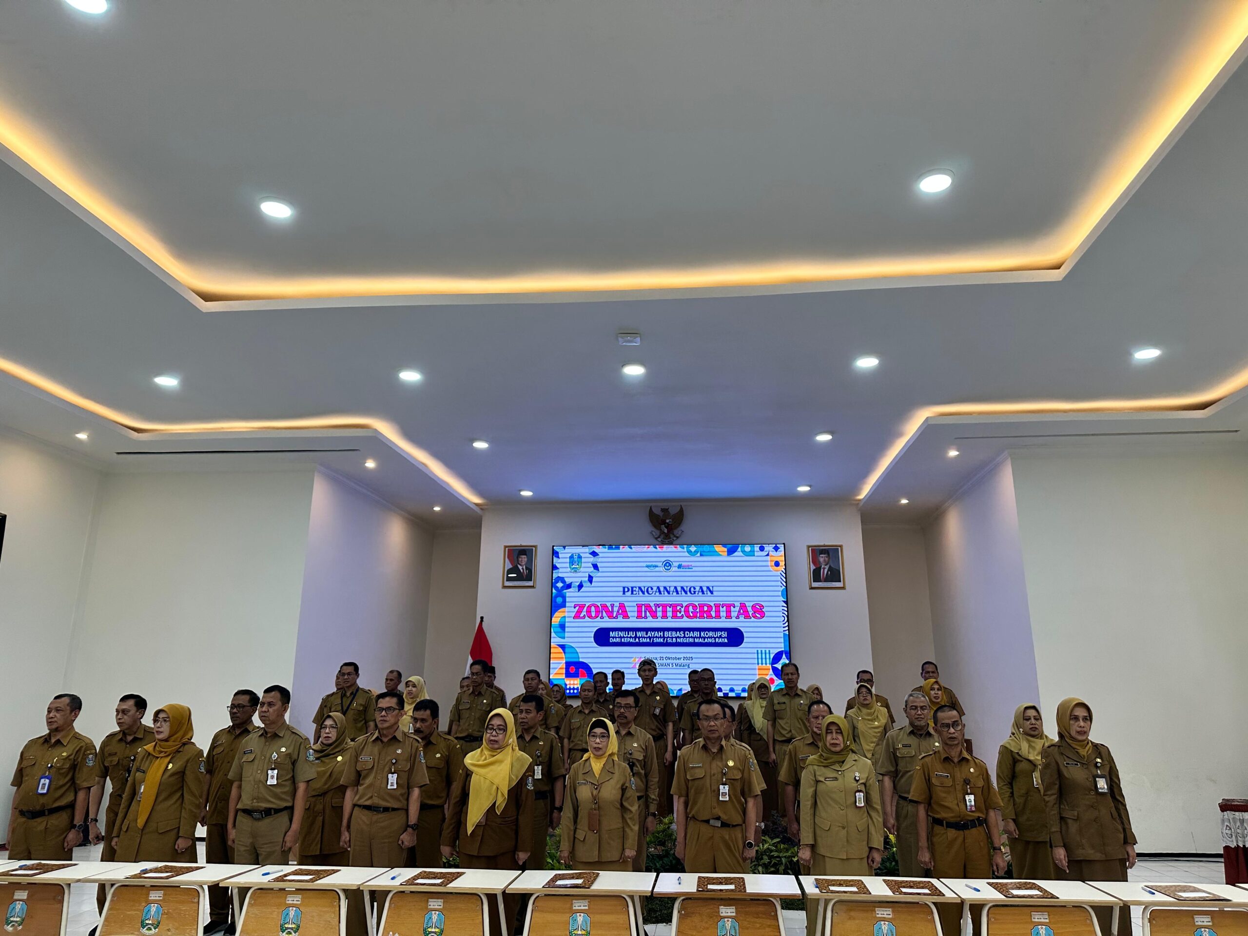 Para kepala SMA/SMK/SLB Negeri se Malang Raya saat mengikuti pencanangan zona integritas menuju wilayah bebas korupsi dan wilayah birokrasi bersih melayani di auditorium SMAN 5 Malang, Selasa (21/10/25).