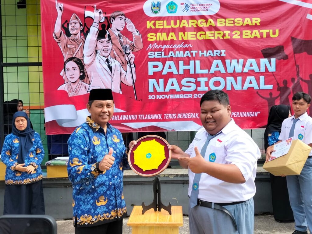 Kepala SMAN 2 Batu, Wartono, S.Pd. S.IP., M.Pd. saat menyerahkan piala bergilir kepada juara 1 dari kelas XI-1 yang diwakili oleh Ziko.