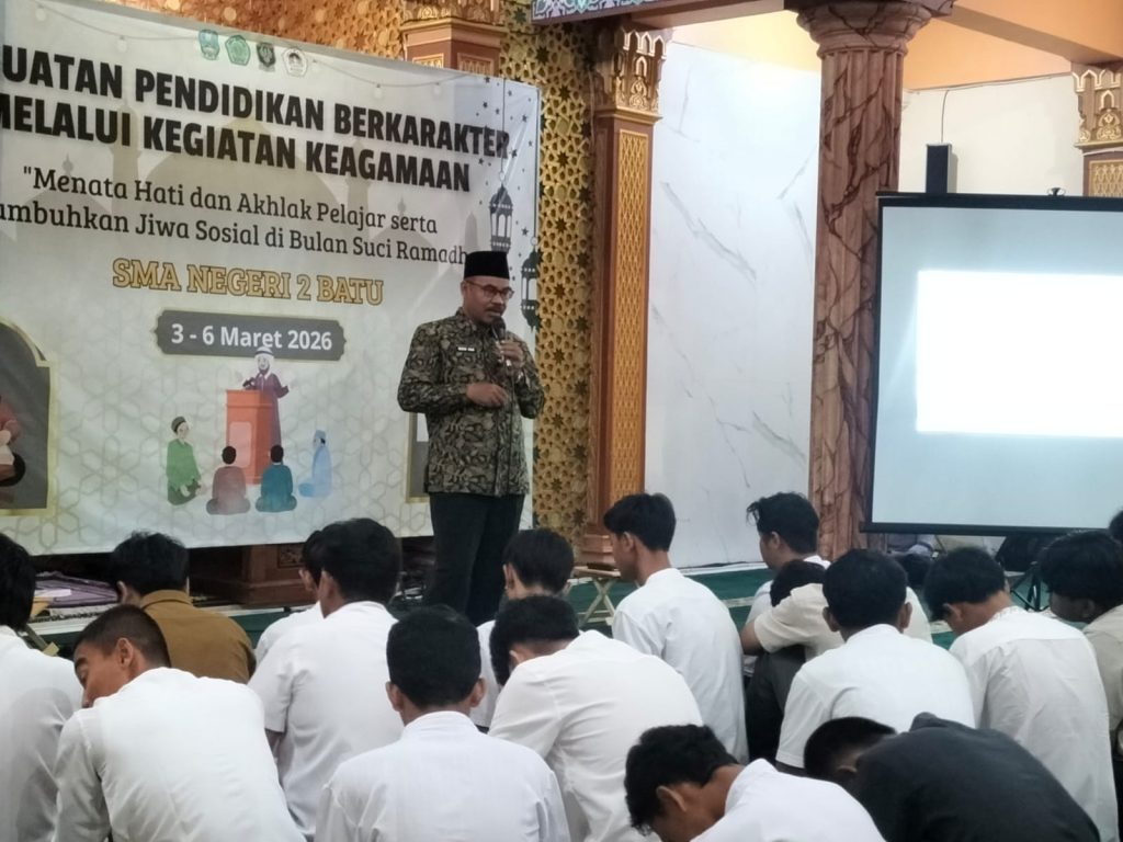 SMAN 2 BATU- Hari ketiga pelaksanaan Pondok Ramadan di SMAN 2 Batu diisi materi puasa dan kesehatan mental yang disampaikan Machfud Efendi, S.Ag., M.Pd., pengawas MTs Kantor Kemenag Kota Batu, Kamis (5/3/26). Dalam paparan materinya, mantan guru agama Islam SMAN 2 Batu itu mengungkapkan ada beberapa manfaat puasa dikaitkan dengan kesehatan mental.