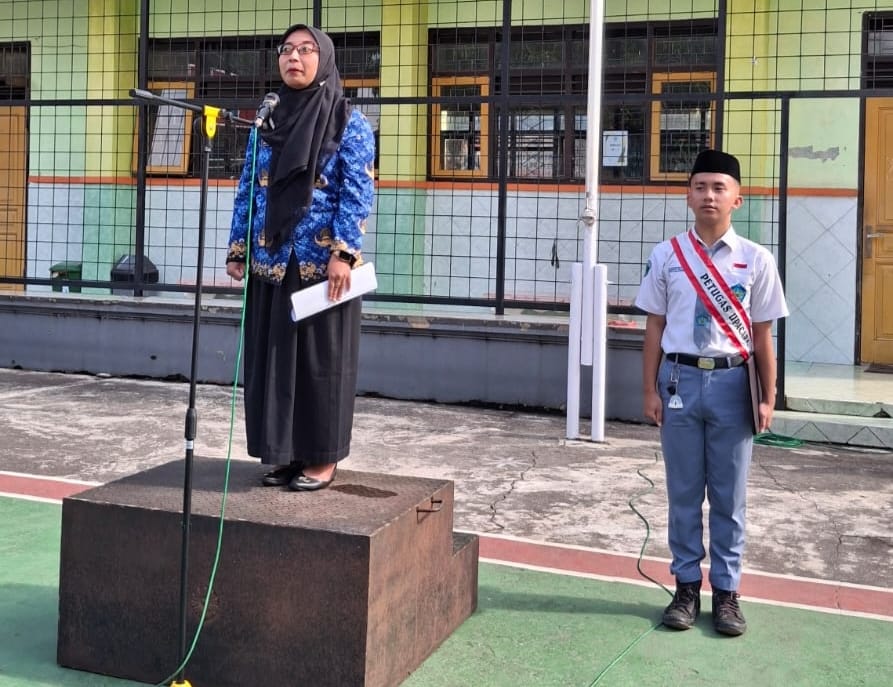 Ayu Dewayanti, S.Pd. pembina upacara saat memberikan sambutan dan membacakan naskah sambutan Menteri Pemuda dan Olahraga pada upacara peringatan ke-97 Sumpah Pemuda tahun 2025 di SMAN 2 Batu.